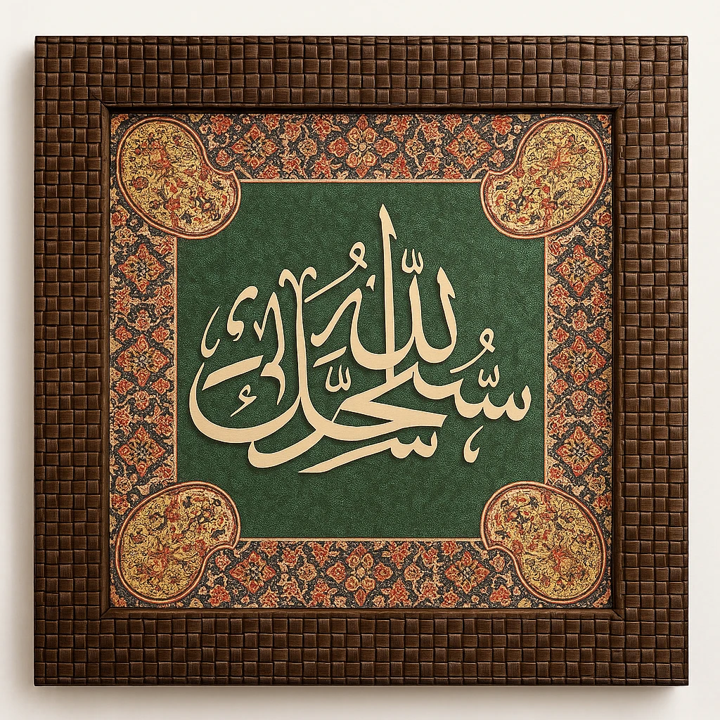 Luxury Islamic Wall Art – Bismillah Arabic Calligraphy Frame with Green Background & Woven Wooden Border